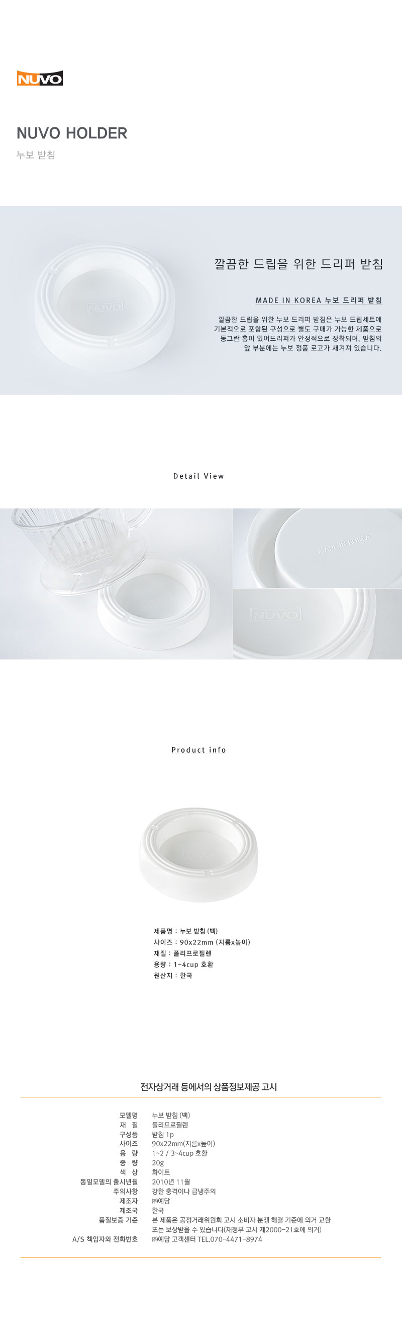 깔끔한 드립을 위한 드리퍼 받침 MADE IN KOREA 누보 드리퍼 받침 깔끔한 드립을 위한 누보 드리퍼 받침은 누보 드립세트에 기본적으로 포함된 구성으로 별도 구매가 가능한 제품으로 동그란 홈이있어 드리퍼가 안정적으로 장착되며 받침의 앞 부분에는 누보 정품 로고가 새겨져 있습니다