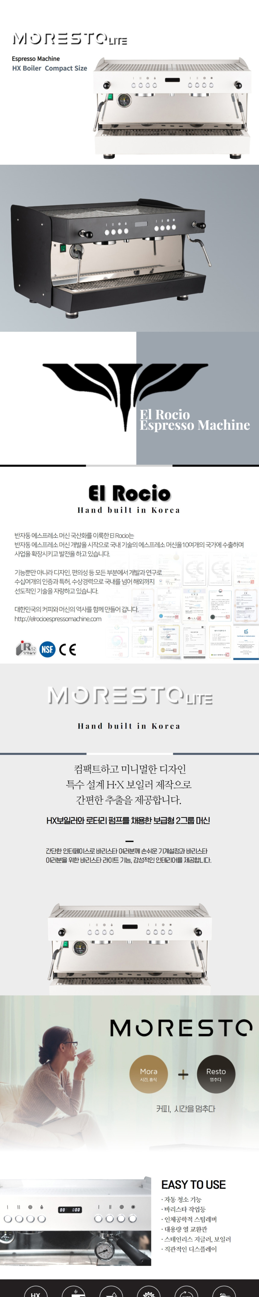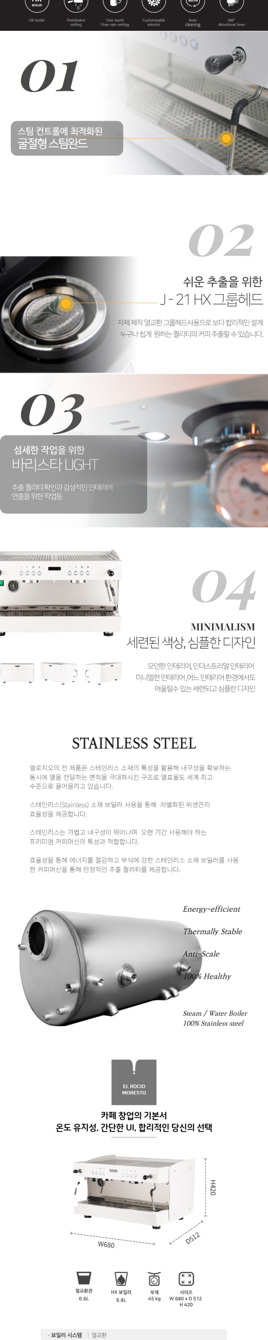 EI Rocio는 컴팩트하고 미니멀한 디자인 특수설계 H.X 보일러 제작으로 간편한 추출을 제공합니다 HX 보일러와 로터리 펌프를 채용한 보급형 2그룹 머신으로 간편한 인터페이스로 바리스타 여러분께 손쉬운 기계설정과 여러분을 위한 작업편의 라이트 기능 감성적인 인테리어를 제공합니다
