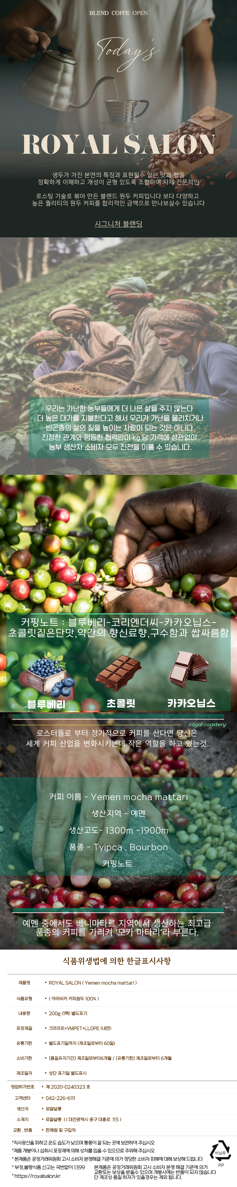 Yemen mocha mattari는 예멘의 높은 산지에서 자라나 Typica와 Bourbon 품종의 조화로 탄생한 고급 싱글오리진 커피입니다. 1300m에서 1900m의 생산 고도에서 재배되어, 블루베리, 코리엔더씨, 카카오닙스, 초콜릿의 복합적인 커핑 노트를 자랑합니다. 짙은 단맛과 약간의 향신료 향, 그리고 구수함과 쌉싸름한 맛의 완벽한 조화가 특징인 이 커피는, 깊이 있는 커피 경험을 찾는 분들에게 이상적인 선택입니다. Yemen mocha mattari와 함께라면, 매일의 커피 시간이 특별한 순간으로 변화될 것입니다. 예멘의 신비로운 맛을 집에서 직접 경험해 보세요.