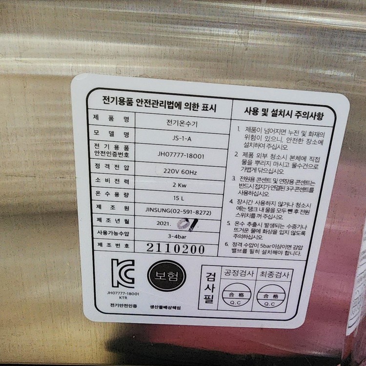 카페용 JS-1-A 전기온수기 / 15L / 2kW / 업소용·주방용 / JINSUNG 정품