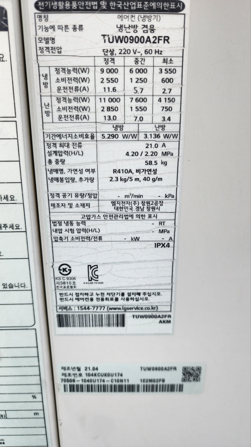 냉방능력: 9,000W