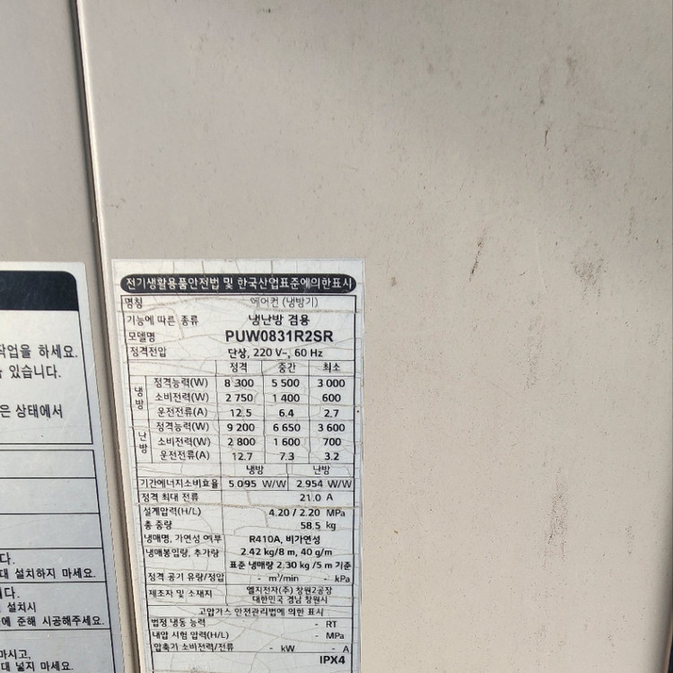 냉매 종류 / 가연성 여부: R410A / 비가연성