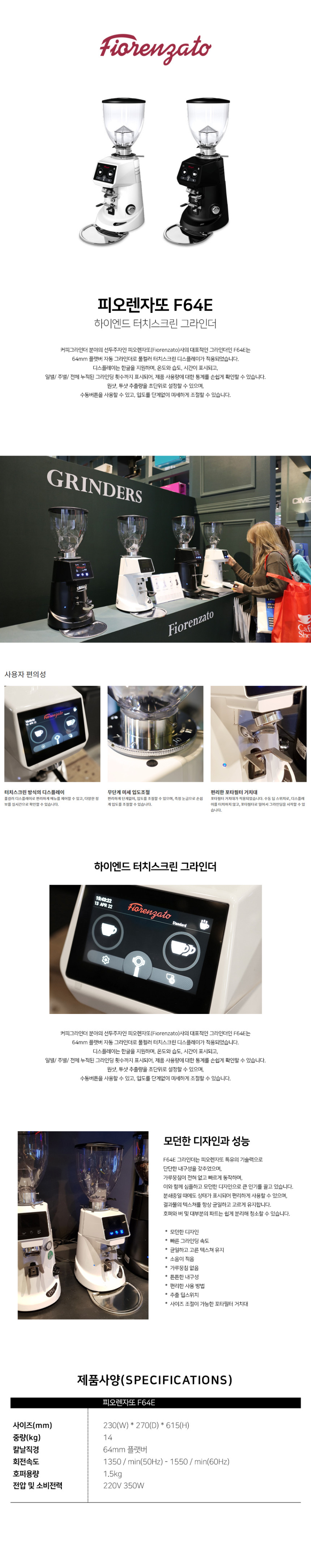 피오렌자또 F64E PRO 자동그라인더는 새로워진 터치스크린 선명하고 직관적인 인터페이스로 업데이트 되었습니다 플랫버 방식의 빠르고 균일한 분쇄 1550 RPM으로 빠르게 회전시켜 원두를 더욱 고르게 분쇄합니다 M340 sfeel 블레이드 BOHLER 사의 강철을 사용하여 블레이드의 수명과 성능을 향상시켰습니다
